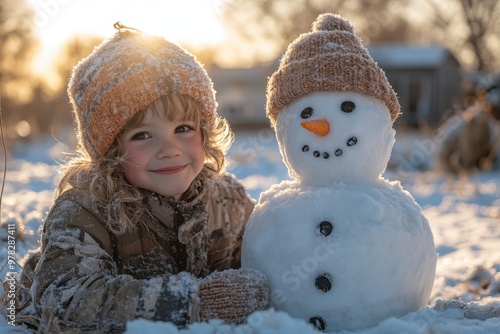 Joyful Children Building Snowman in Snowy Backyard - Winter Fun and Creativity Concept