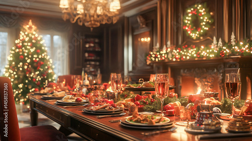 Joyful Christmas Dinner Celebration, Family Friends Gather Around the Table Meal, Enjoying Delicious Food and Drinks in Beautifully Decorated Home, Creating Happy Memories During Holiday Event