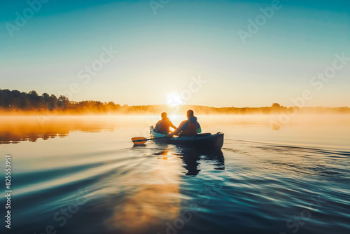 Joyful couple kayaking on calm lake at dawn, sharing peaceful and romantic moment.