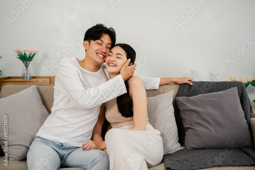 Joyful couple shares a tender moment, laughing and embracing on a cozy sofa in a warmly decorated living room.