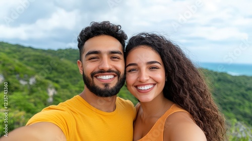 Joyful couple taking selfie in nature with vibrant greenery and ocean backdrop