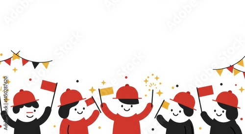Joyful crowd celebrating with flags and festive decorations on white background