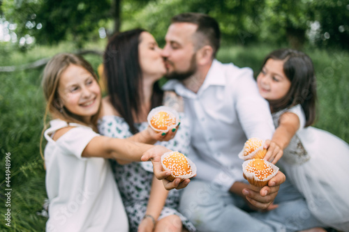 Joyful cute sisters eating delicious cupcakes while father and mother kissing on background. Young family spending leisure time together outdoors. Summer picnic at garden.