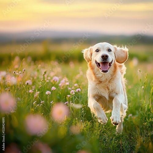 Joyful dog running freely through an expansive meadow filled with colorful wildflowers under a bright blue sky