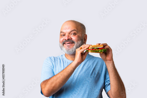 Joyful elderly old indian asian man having a veg sandwich standing isolated on white background.