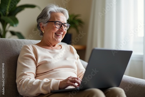 Joyful elderly woman using laptop on sofa at home - embracing technology with a smile