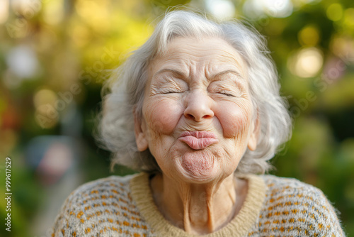 Joyful Elderly Woman with Puckered Lips in Morning Light