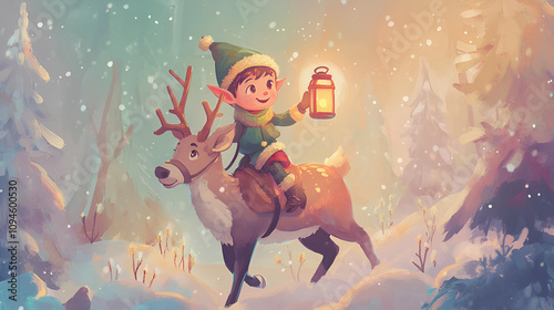 Joyful elf riding a reindeer in a snowy forest fantasy art winter wonderland whimsical scene magical journey