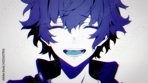 Joyful Expression of a Cartoon Character with Purple Hair and a Bright Smile on a Light Background