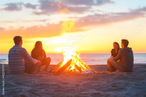 Joyful Friends Gathering Around Sunset Campfire on Beach