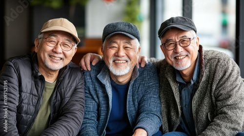 Joyful Friendship Among Senior Men in Casual Attire Sharing Laughter and Smiles in a Cozy Coffee Shop Setting Captured in Beautiful Natural Light