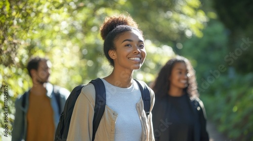 Joyful group of friends enjoying a sunny day while exploring nature on a hiking trail surrounded by lush greenery