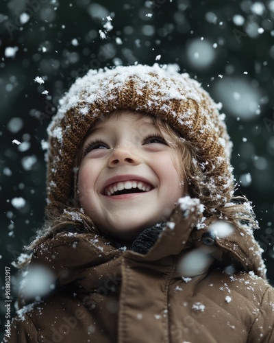 Joyful Happy Kid Laughing as Snowflakes Fall