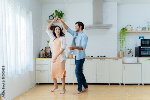 Joyful happy romantic multiracial couple in love, in stylish casual clothes, mixed race guy and caucasian girl, having fun together at home, dancing in the kitchen