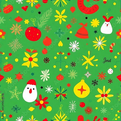 Joyful Holiday Seamless Pattern: Celebrate the festive season with this cheerful and whimsical pattern. It features a captivating blend of traditional holiday elements such as snowflakes, ornaments.