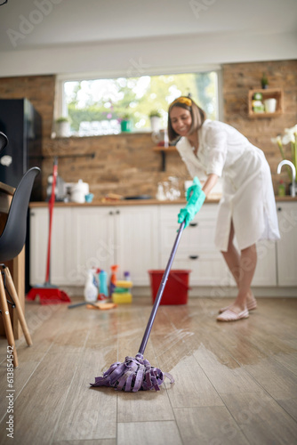 Joyful housewife cleaning the kitchen, wet mopping the floor, with chemical bottles in the background.
