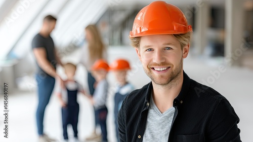 Joyful male construction worker interacts with children at vibrant playground on sunny day in urban area