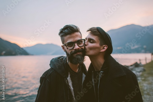 Joyful man receiving a kiss from his boyfriend by a lake with mountains in the background on a romantic trip