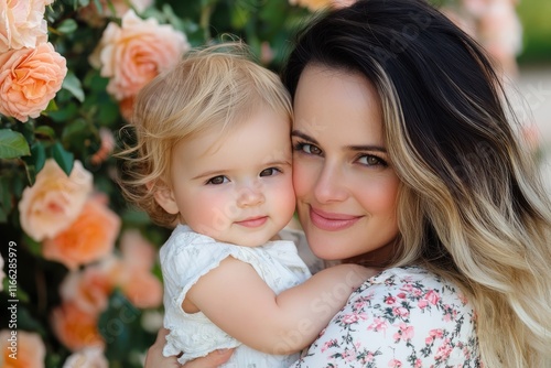 Joyful moments shared between a mother and her toddler amidst blooming roses in a sunny garden