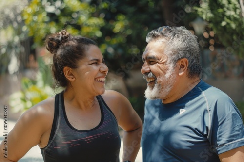 Joyful older Hispanic man and woman engage in exercise outdoors
