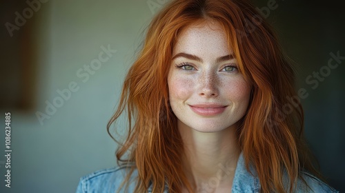 Joyful redhead in a denim jacket radiates happiness in a bright studio portrait, showcasing her youthful style.