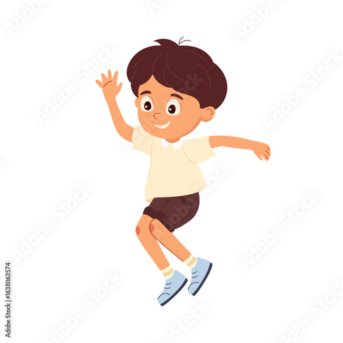 Joyful schoolboy celebrating back to school and personal success. Smiling cartoon child in festive outfit jumping with excitement Vector illustration for card, banner, poster, print or design element