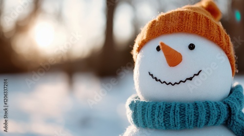 Joyful snowman celebrates Christmas and New Year in a snowy forest