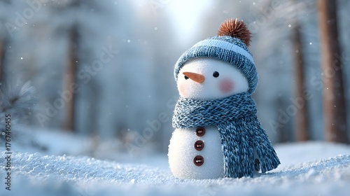 Joyful snowman with festive scarf and hat stands in a snowy winter forest