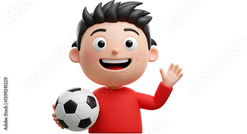 Joyful soccer kid with ball. Cheerful cartoon boy waves with soccer ball. Positive energy and childlike happiness in this 3D render.