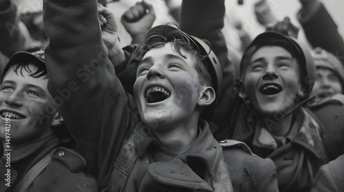 Joyful Soldiers Cheering in Black and White War Victory Scene