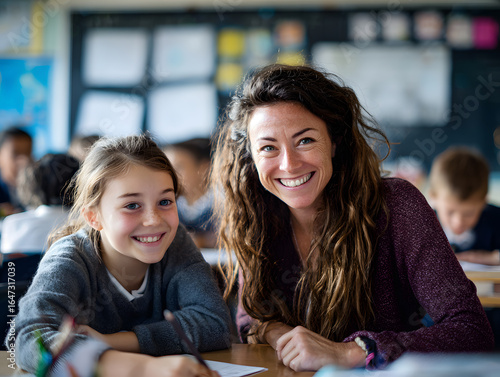 Joyful teacher and student share a bright smile in a lively classroom setting