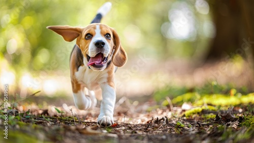 Joyful Tri-colored Beagle Puppy Running Excitedly On Forest Path During Outdoor Adventure