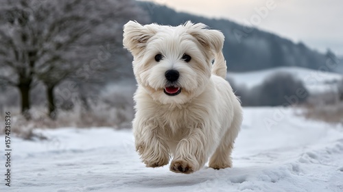 Joyful white fluffy dog running through a snowy winter landscape with trees and hills