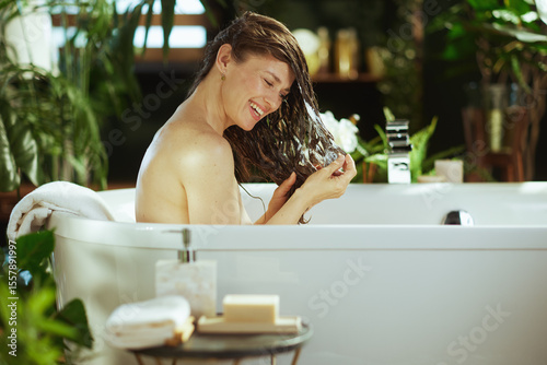 Joyful Woman Applying Hair Treatment in Bath
