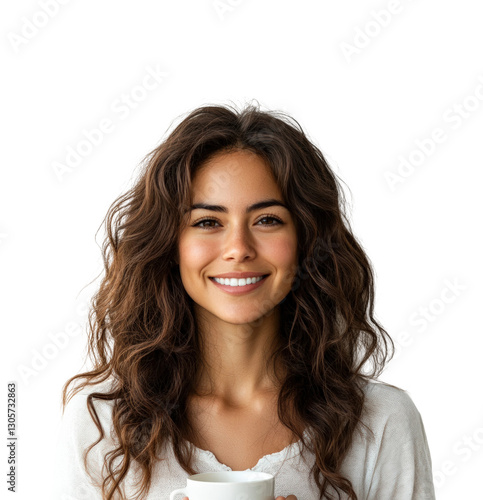 Joyful woman holding coffee cup portrait bright environment smiling viewpoint lifestyle concept isolated on transparent background