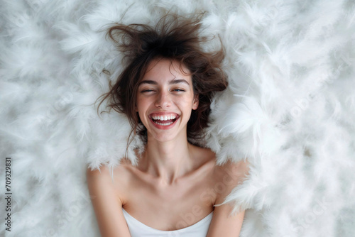 Joyful woman lying on a fluffy white surface with a bright smile Generative AI image