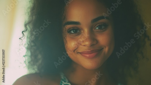 Joyful woman savors her morning coffee in a bright kitchen filled with natural light, embodying a moment of tranquility and happiness