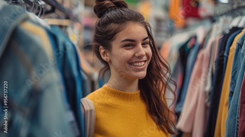 Joyful woman shopping for trendy jeans in a stylish clothing store surrounded by fashionable outfits