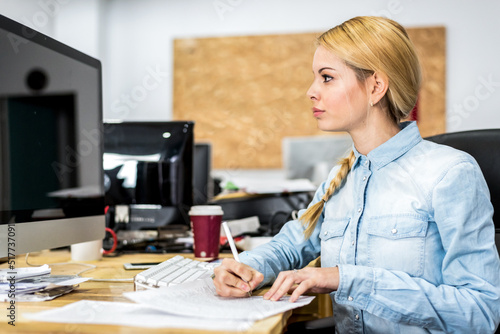Joyful woman working with document and computer