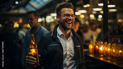Joyful work celebration, colleagues toast, lively atmosphere.
