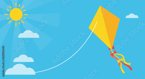 Joyful yellow kite soars high in the sunny sky on a bright day, perfect for children's designs