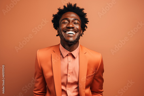 Joyful Young Black Man in Peach Fuzz Suit on Studio Background