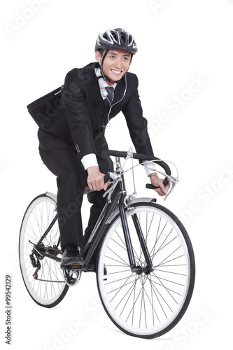 Joyful young businessman riding a bike