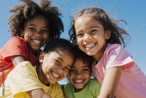 joyful young children playing together under sunny skies with smiles, embodying happiness and friendship