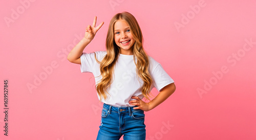 Joyful young girl flashing peace sign with a bright smile, exuding happiness and youthful energy.