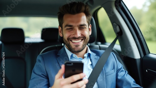 Joyful young professional engaged with smartphone while seated in car's backseat