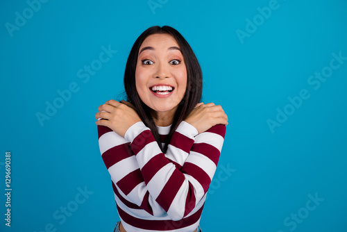 Joyful young woman embracing herself with a happy smile in front of a bright blue background