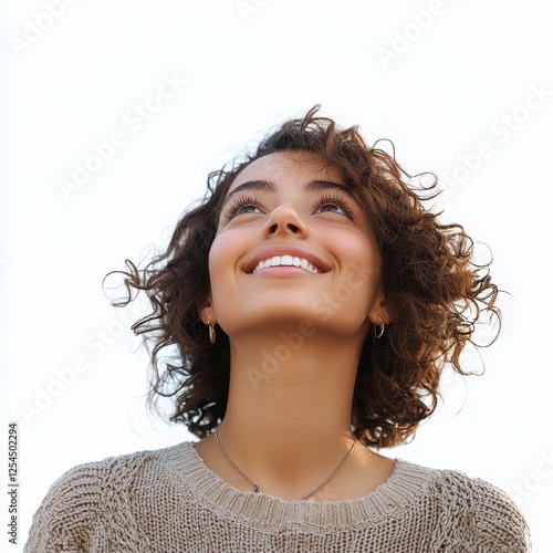 Joyful young woman with curly hair looking upward in a cozy sweater, embodying happiness and positivity against a neutral background