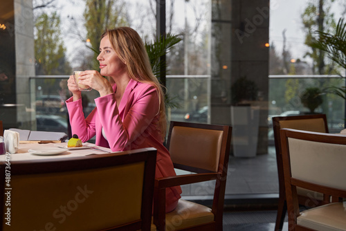Joyous woman in stylish clothes enjoying coffee at hotel lounge