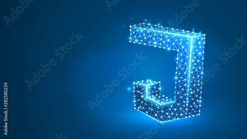 JS, Java Script coding language sign. Device, programming, developing concept. Abstract, digital, wireframe, low poly mesh, Raster blue neon 3d illustration Triangle, line dot